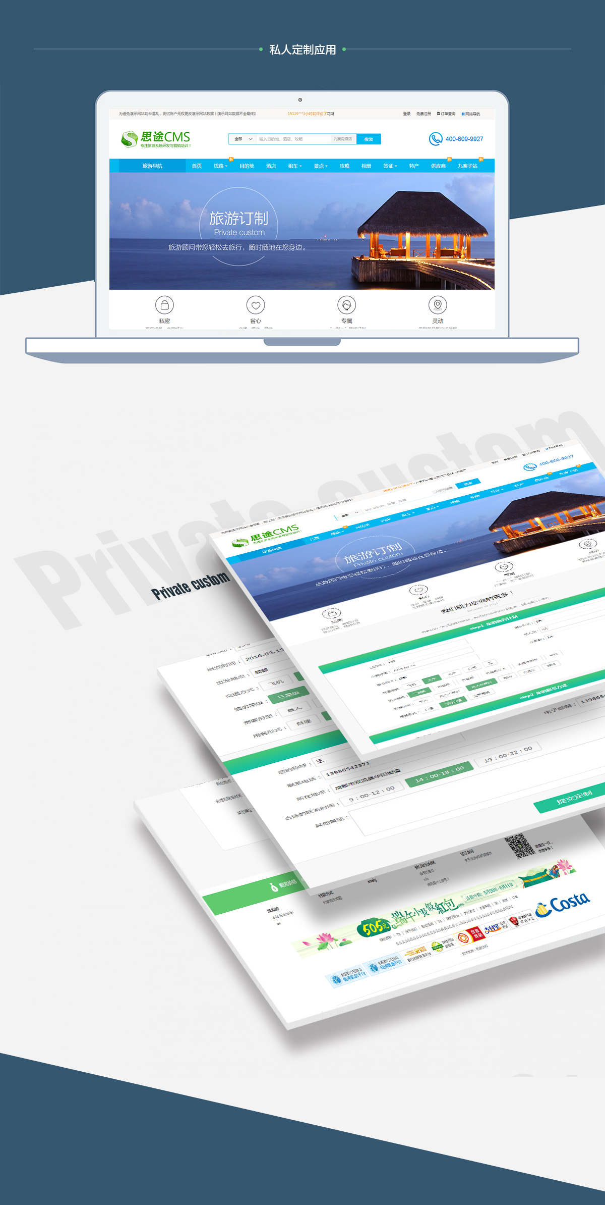 商家安裝該模塊后,游客可在前臺發起私人定制申請,后臺管理人員可查看申請,并隨時聯系游客,為其量身定制出行計劃。