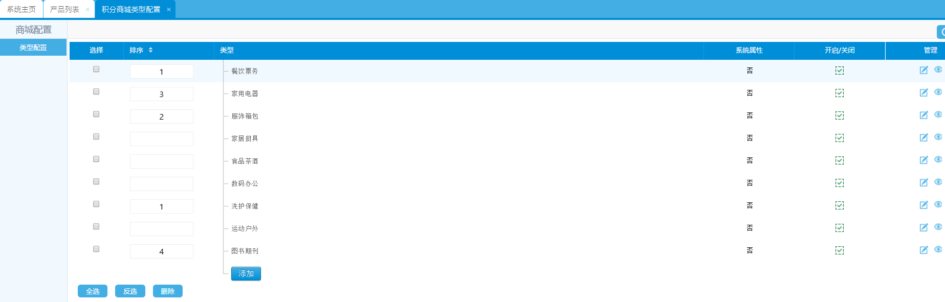 2、商城配置:用于商城所兌換產品的分類,僅支持一級