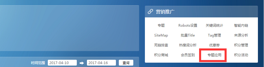 在:營(yíng)銷(xiāo)推廣》專(zhuān)題應(yīng)用》管理》欄目?jī)?nèi)容這個(gè)頁(yè)面最下方有一個(gè)更多按鈕的填寫(xiě)框