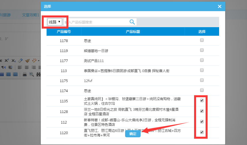 選擇好產(chǎn)品類(lèi)型后,比如勾選了線路產(chǎn)品,彈窗內(nèi)就會(huì)產(chǎn)品線路類(lèi)的相關(guān)產(chǎn)品