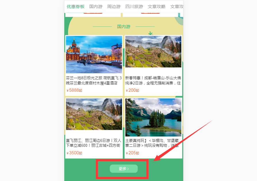 以上步驟操作完成后,專(zhuān)題頁(yè)面國(guó)內(nèi)游板塊就會(huì)展示勾選的這幾個(gè)線路產(chǎn)品