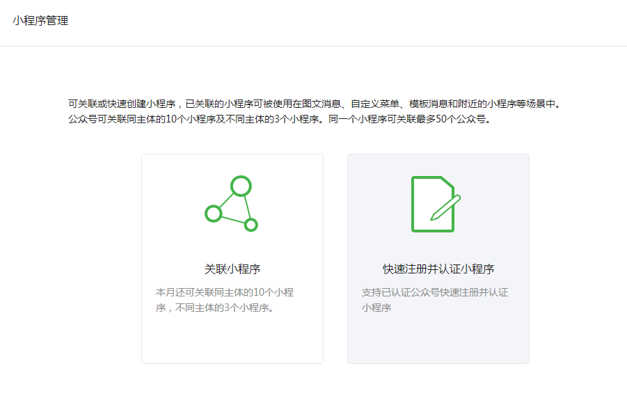 下圖是通過快速創建小程序后,公眾號平臺的展示效果,可以看到已經顯示關聯上該小程序: