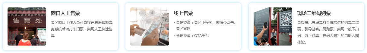 思途自主研發(fā)的景區(qū)票務系統(tǒng),支持多渠道在線售票,既可實現(xiàn)游客“在線一鍵購票、掃碼快速入園”自助化入園體驗,同時也支持窗口人工售取票的人性化服務流程,既可有效節(jié)省景區(qū)人力成本,解決游客排隊煩惱。