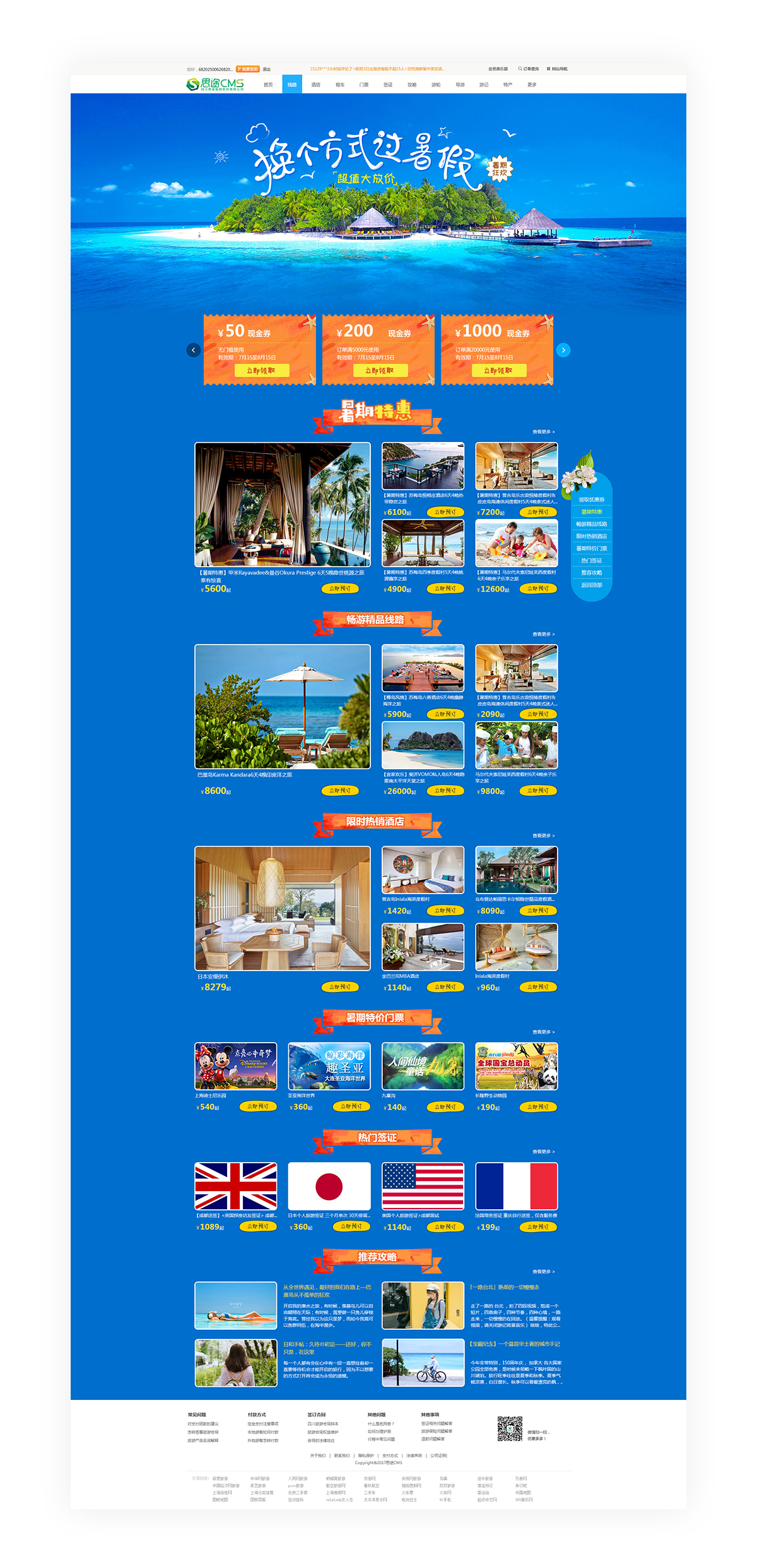 (專題頁)此模板為樂玩暑假專題模板,模板以暑期為主題,頁面整體設計風格上突出清涼的夏日氣息。頁面可添加多種優惠券,適合用來進行暑期出游的專題營銷。頁面模塊分類清晰,一目了然,提供給客戶良好的體驗。每個模塊排版整齊,美觀大氣。使用此模板可以幫助網站更好地進行暑期出游的促銷,建議網站提前購買,配置產品,為暑期活動、促銷做準備。